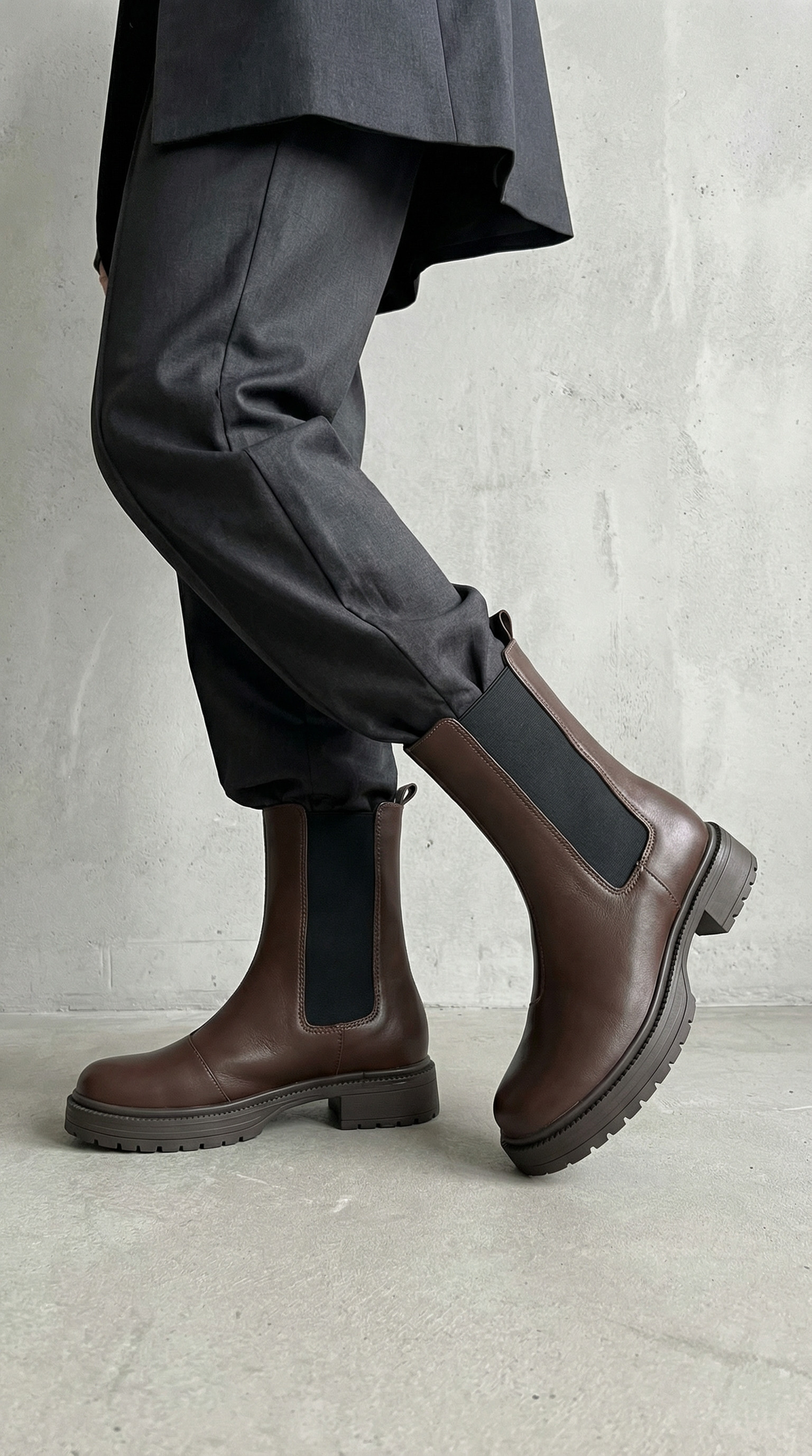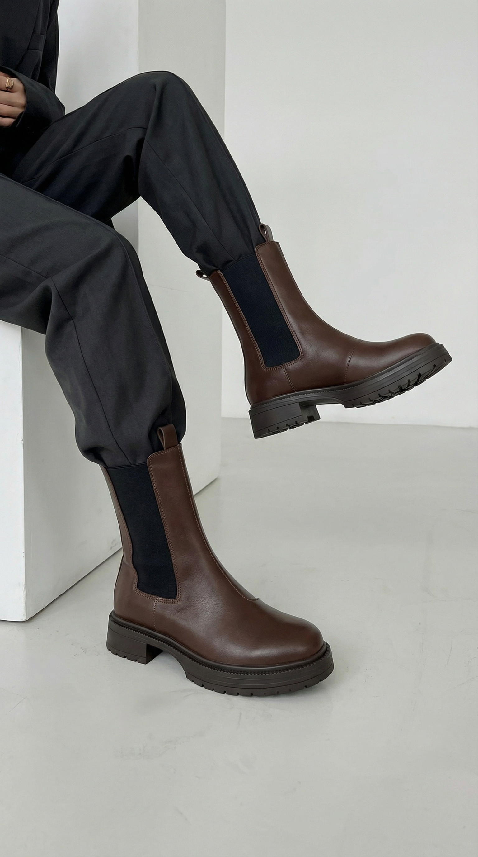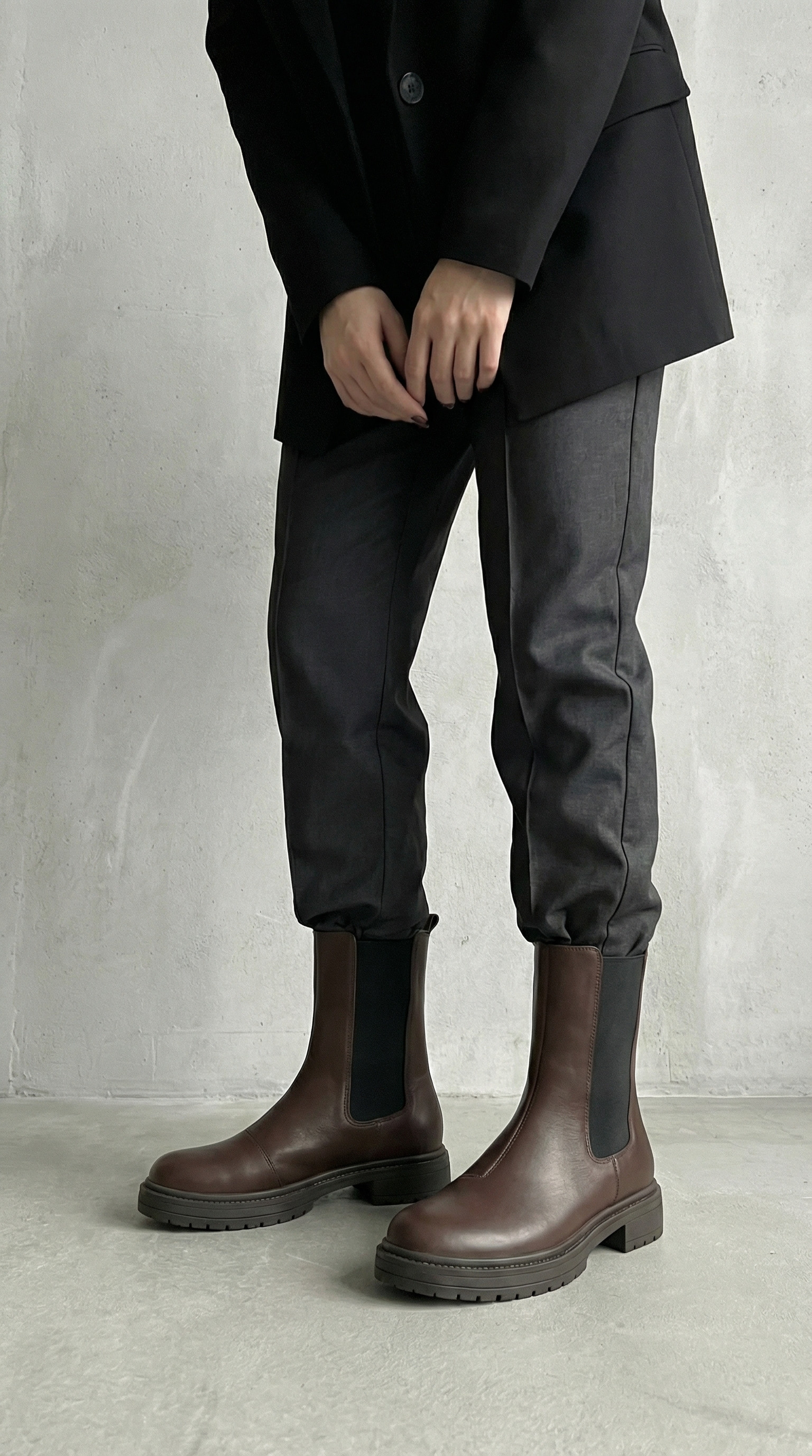Черевики Dilara — базові челсі середньої висоти з натуральної шкіри. Підошва не масивна, зі стриманим тракторним протектором, не важка, виконана з термогуми, не ковзка.