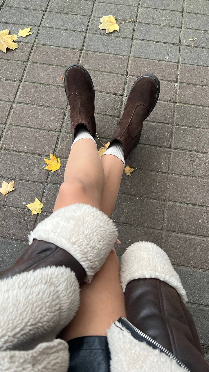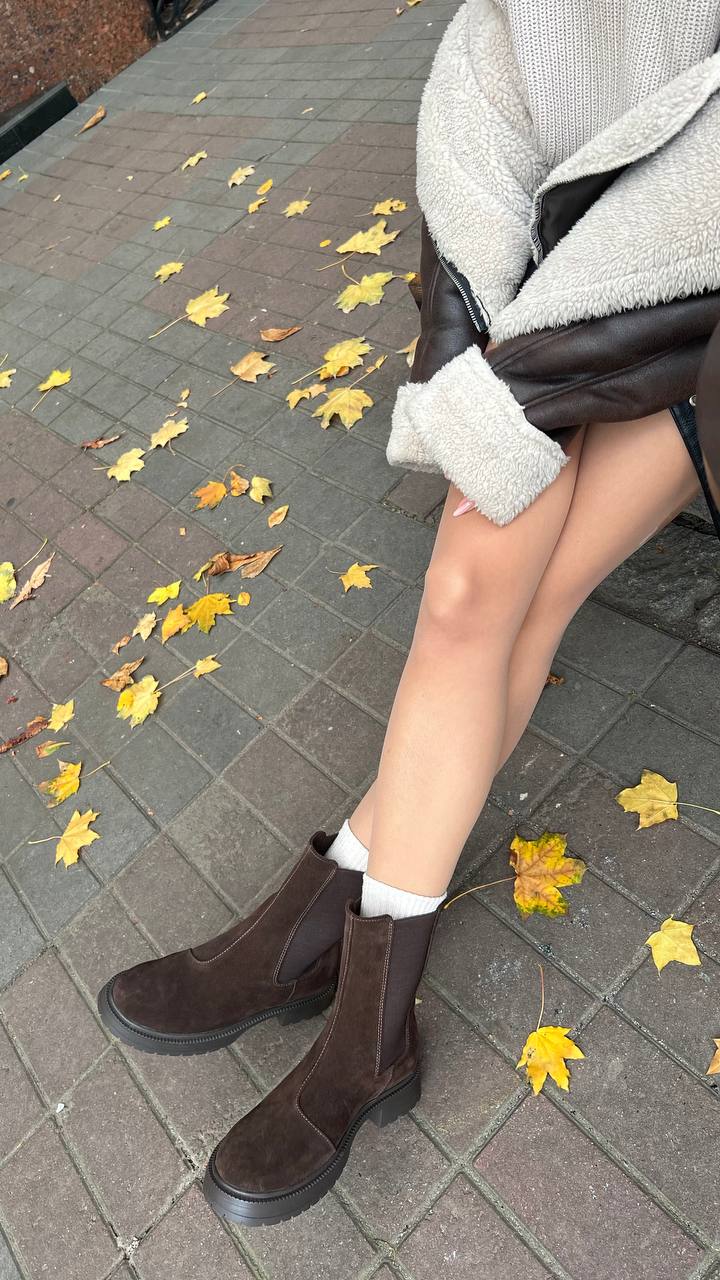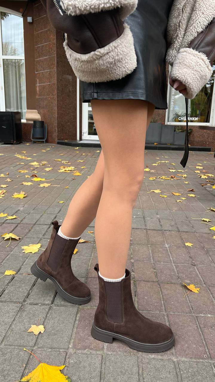 Черевики Dilara — базові челсі середньої висоти з натуральної замші. Підошва не масивна, зі стриманим тракторним протектором, не важка, виконана з термогуми, не ковзка.