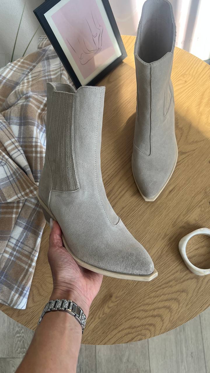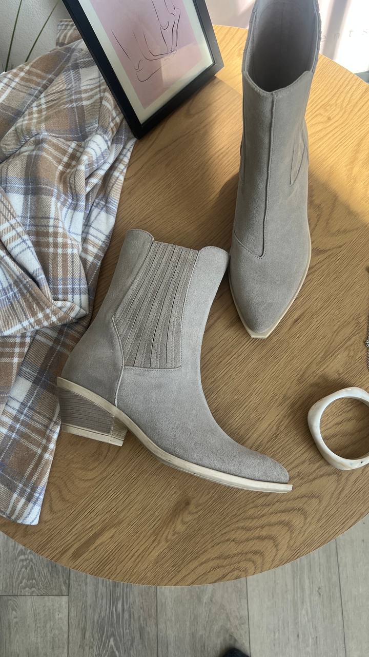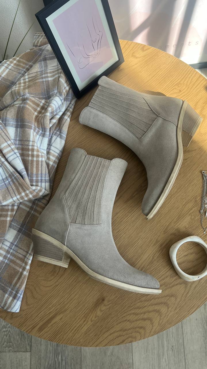 Високі ковбойки-челсі Milano — ботильйони з натуральної замші, висота 19,5 см (не враховуючи підошви). Підборчик 5 см. Колодка дуже зручна, йде розмір в розмір, наявність підбору майже не відчувається) Наявність резинок за бокам спрощує експлуатацію.