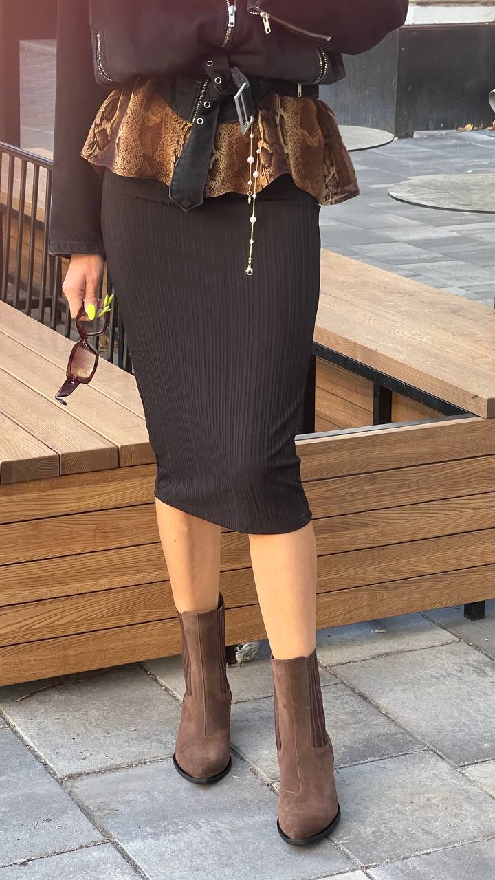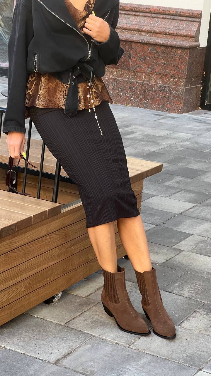 Високі ковбойки-челсі Milano — ботильйони з натуральної замші, висота 19,5 см (не враховуючи підошви). Підборчик 5 см. Колодка дуже зручна, йде розмір в розмір, наявність підбору майже не відчувається) Наявність резинок за бокам спрощує експлуатацію.
